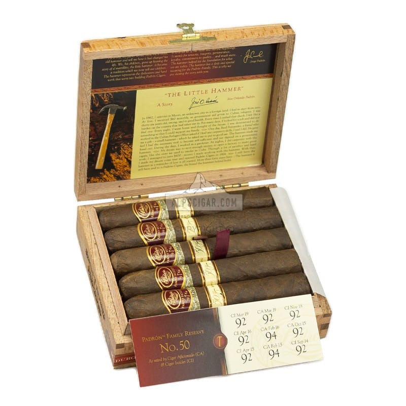 Le Padrón Family Reserve N° 50 Maduro est proposé en boîte de 10 cigares. Il existe en cape Natural et Maduro.